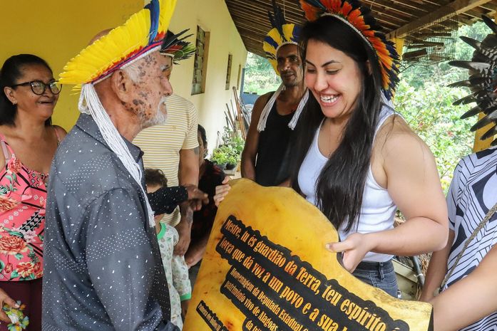 Simbolismo e emoção foram as palavras que descreveram a visita da Deputada Estadual Gabi Gonçalves (PP), a tribo Xucuru-Kariri, localizada na cidade de Palmeira dos Índios, na Semana dos Patrimônios Vivos e Culturais de Alagoas, criação da parlamentar através da lei 9.188/24 que incluiu a semana no calendário oficial do Estado. Durante a visita, Gabi Gonçalves entregou uma homenagem especial ao indígena Antônio Celestino, o primeiro indígena de Alagoas a ser reconhecido como Patrimônio Vivo, para celebrar o respeito e a valorização das tradições indígenas.
