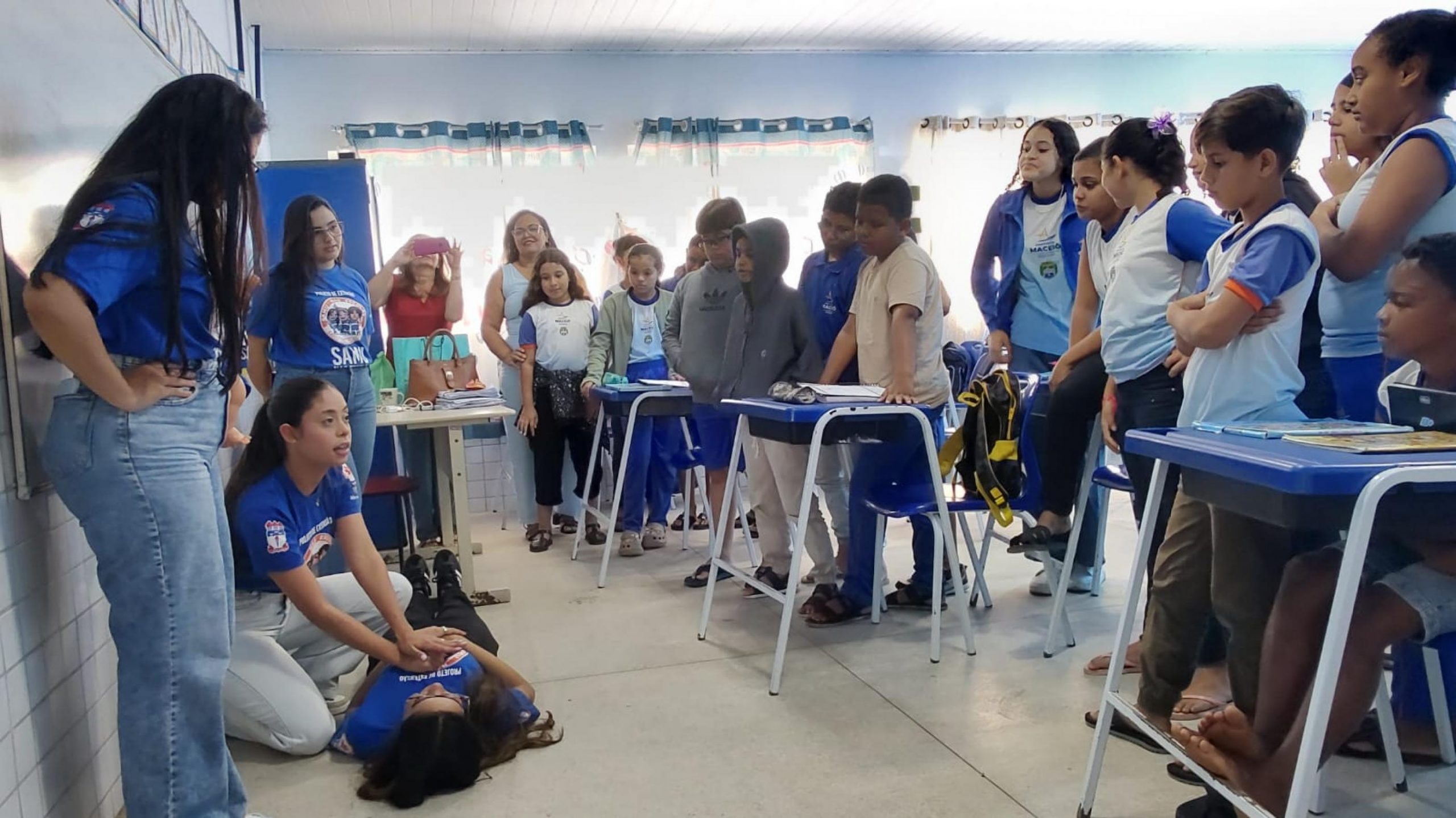 Acadêmicos de medicina e enfermagem, previamente capacitados por profissionais do Samu, são os responsáveis por levar às salas de aula noções práticas sobre como agir em situações como engasgo, desmaio, choque elétrico, quedas com fraturas e queimaduras.